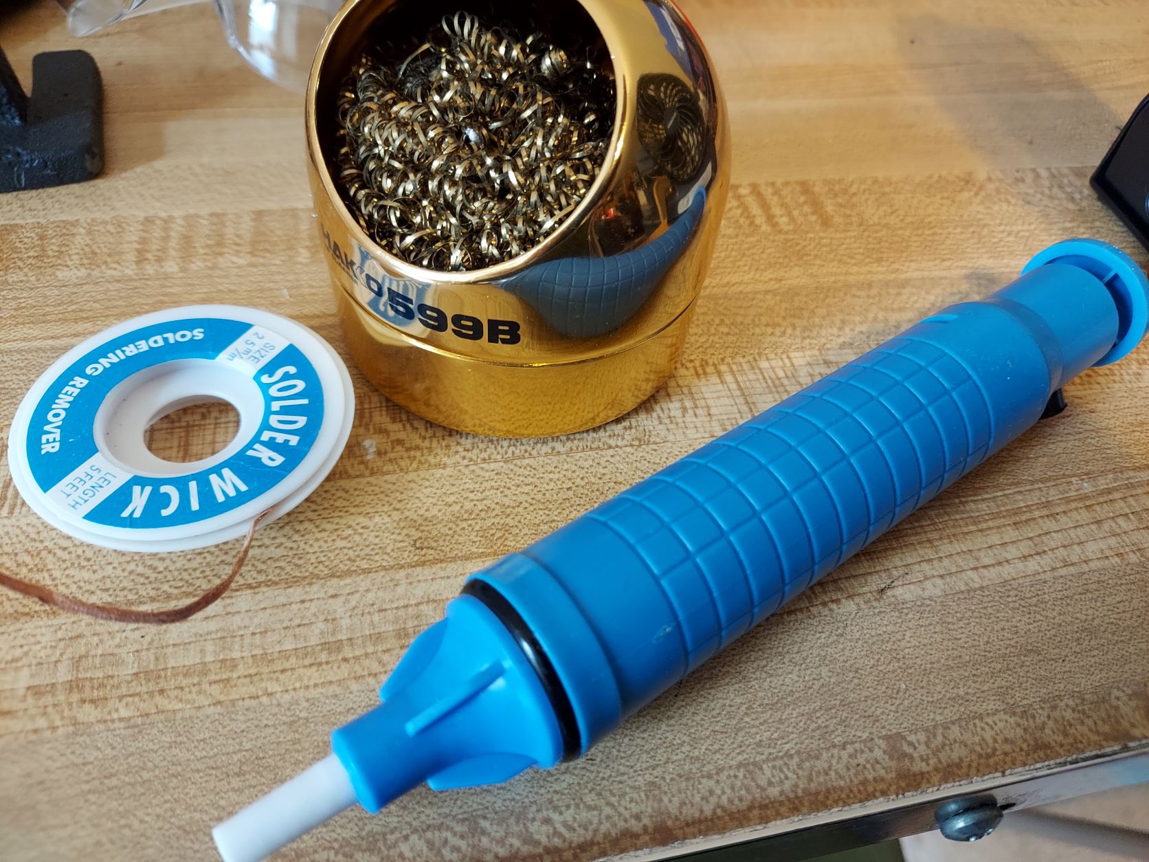 Over the course of soldering, the solder coating the tip of the soldering pen will discolor and become ineffective. To clean the old solder one can use a small wet sponge, it often comes with the soldering kit, or a brass wool solder scraper. I use both. Solder suckers and solder wicks are useful when one accidentally uses too much solder on a joint and bridges two wires together. Solder wicks are copper braids that soak the excess solder, while solder suckers are retractable pen that sucks a small chunk of solder.