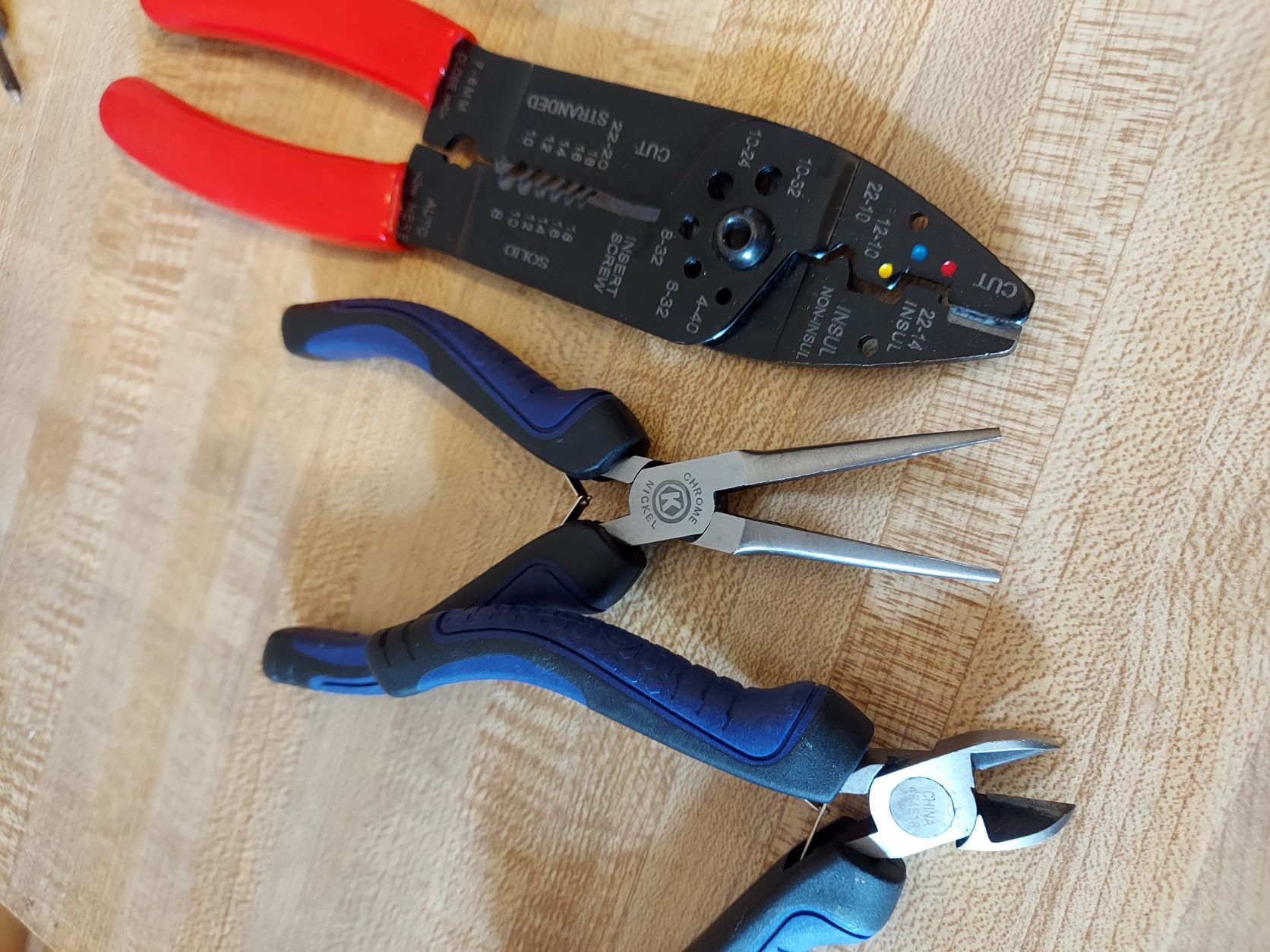 Generic wire cutters are so important, that one might even have multiples, like angled wire cutters for circuits in a small housing. While some use pocket knives for wire strippers (to trim the plastic coating off wires), I prefer having a multi-gauge wire stripper.