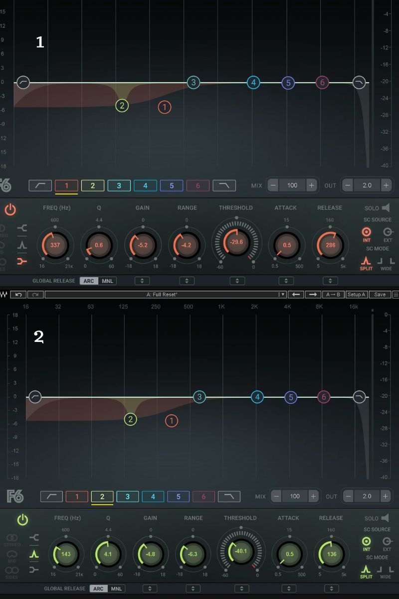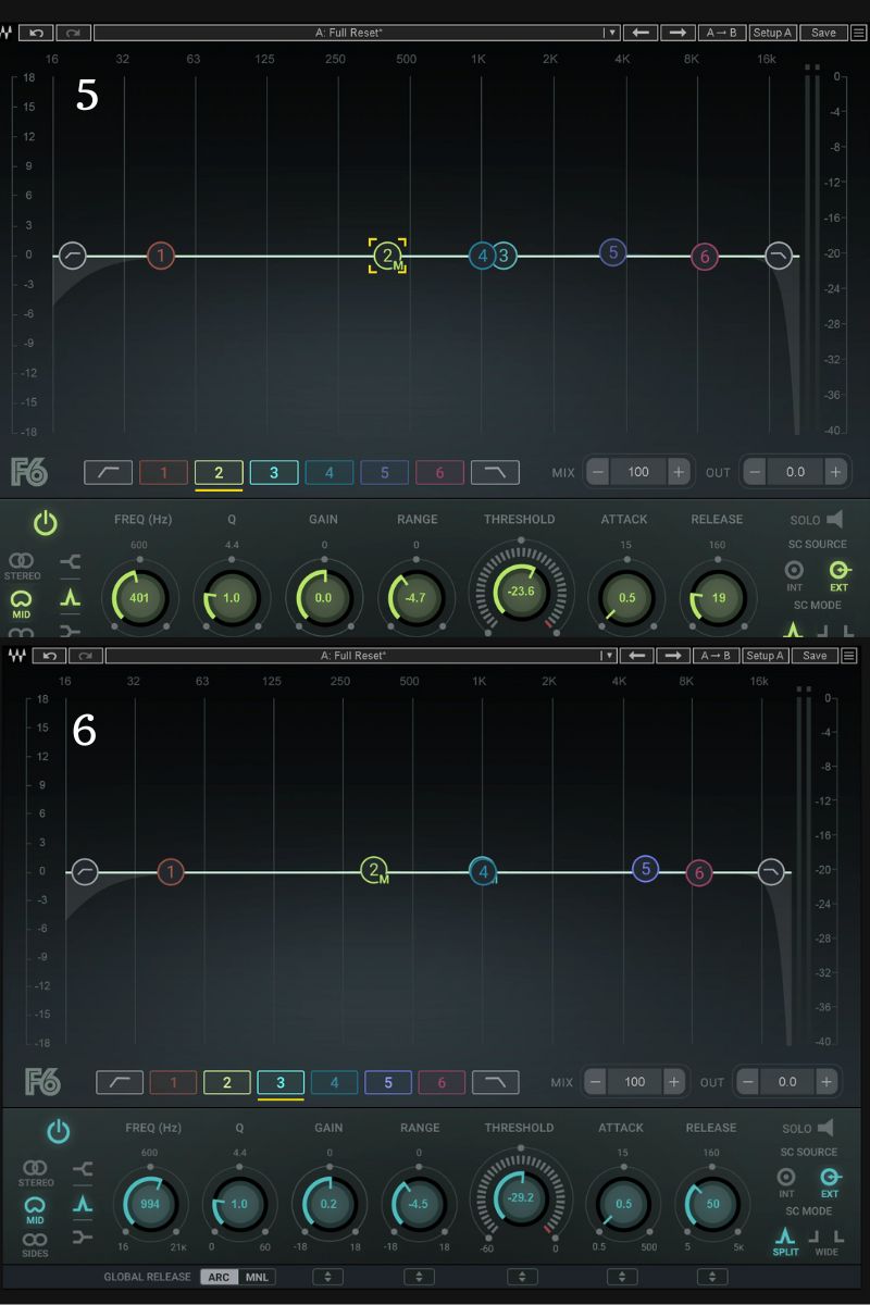 Using a sidechain within dynamic EQs will help achieve vocal clarity in a busy mix. To compete with masking frequencies, you can key from an input to only attenuate certain bands when a threshold is crossed, allowing them to return to position when the band is not triggered. For instance, a male vocalist singing within a dense mix might compete for space with the rhythm guitar or lead guitar. You can throw an instance of your flavor of dynamic EQ onto the rhythm guitar channel and tell it to attenuate low mids at a desired Q (example 5) and engage it for a specific period of time; when the vocalist backs away, those bands will once again fill the appropriate gap in the mix. Example 6 here shows the same 400 Hz attenuation and also another just under 1kHz. I also tend to reach for this plugin if I want to soften harsh harmonic content, instead of opting for something that’ll squish a broader frequency range. It’s also important to note that you can choose to process bands in mid-side or stereo modes.