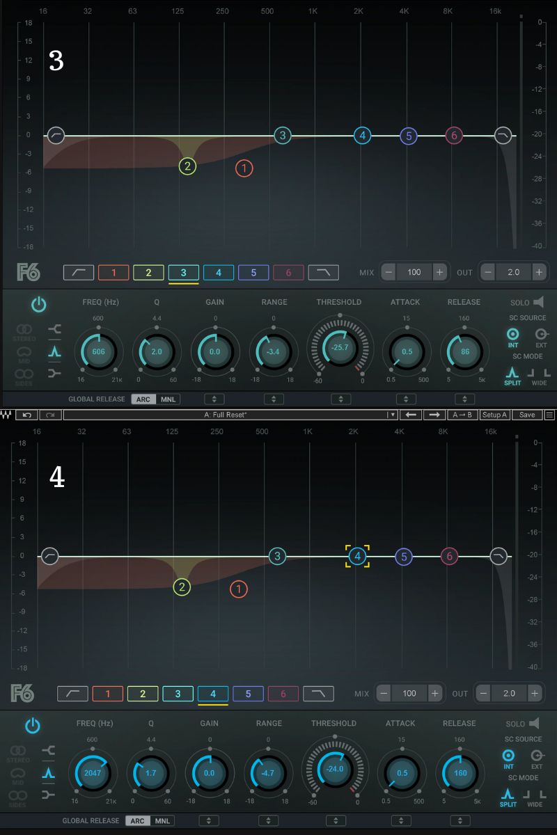 I will typically lean on a dynamic EQ as opposed to a multiband because of their ability to maintain more musical processing; the dynamics of the artist’s performance can be managed more effectively, in instances of proximity effect, or if their voice becomes strident throughout. In previous applications, while using Waves F6, I was able to simultaneously apply some subtractive EQ to the input (example 1), and also adjust a variety of bands throughout the vocalist’s range to accommodate for proximity; sibilance; resonances (example 3 and 4); and occasional nasal buildup or lack of clarity when the artist was feeling under the weather. You can see these in the examples below. Each band has varying release times, but this was determined by listening to the source and dialing it in to taste.
