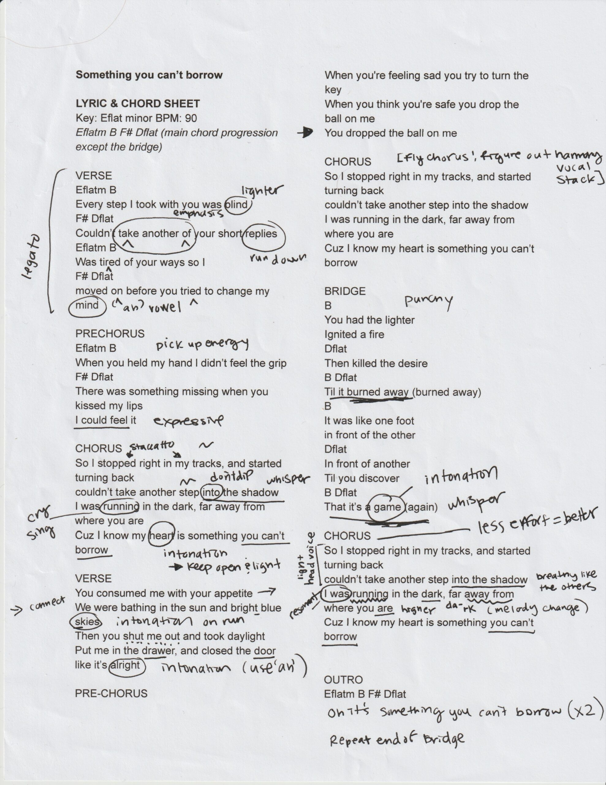 Utilize a Lyric Sheet to mark up notes for your vocal performance (check out the end of this blog post for an example lyric sheet to one of my songs!). The lyric sheet notes can be personal scribbles that make sense to you – it’s great to include expressive notes for the lyrics, technical/vocal cues you need to remember, and any tips about how you will sing or emphasize certain words, phrases or sections of the song. Be extremely detailed here and don’t be afraid to edit / adjust things as you refine the performance.