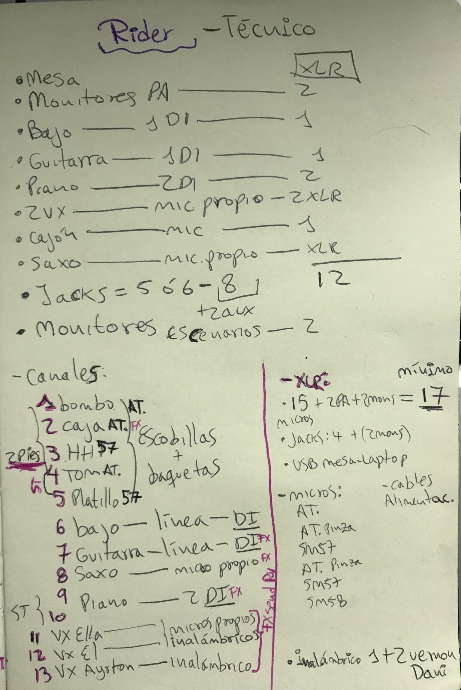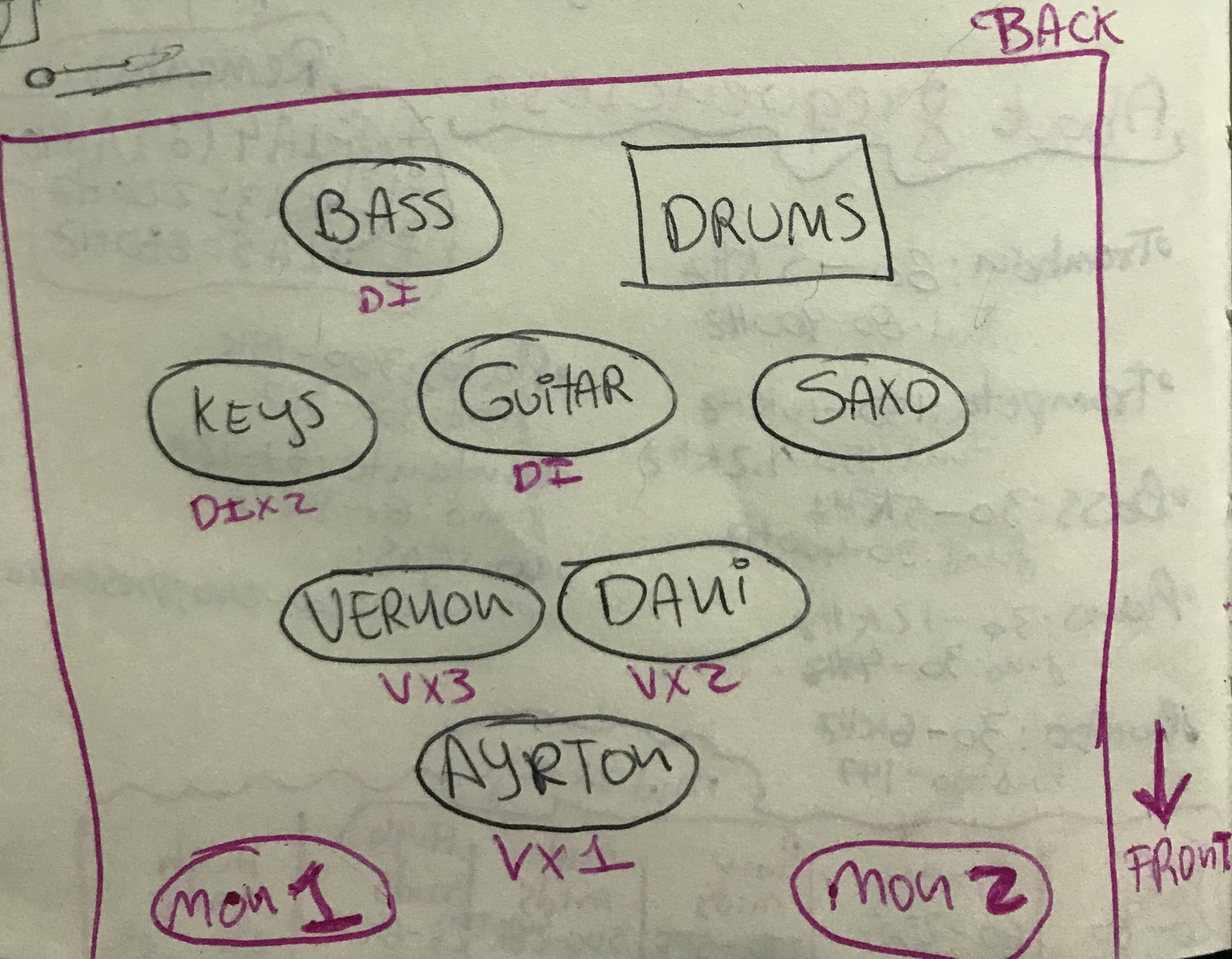 I like to make diagrams using paper and pen, creating an input list including the channels the microphones/DIs, sends to FX, the monitors and how many XLR lines. If it’s going to be recorded, I set up my session in Pro Tools to save some time also. This way, when the day comes, I’m as ready as possible. I always make changes, but that’s part of a live show. These diagrams save me some time and unnecessary surprises.