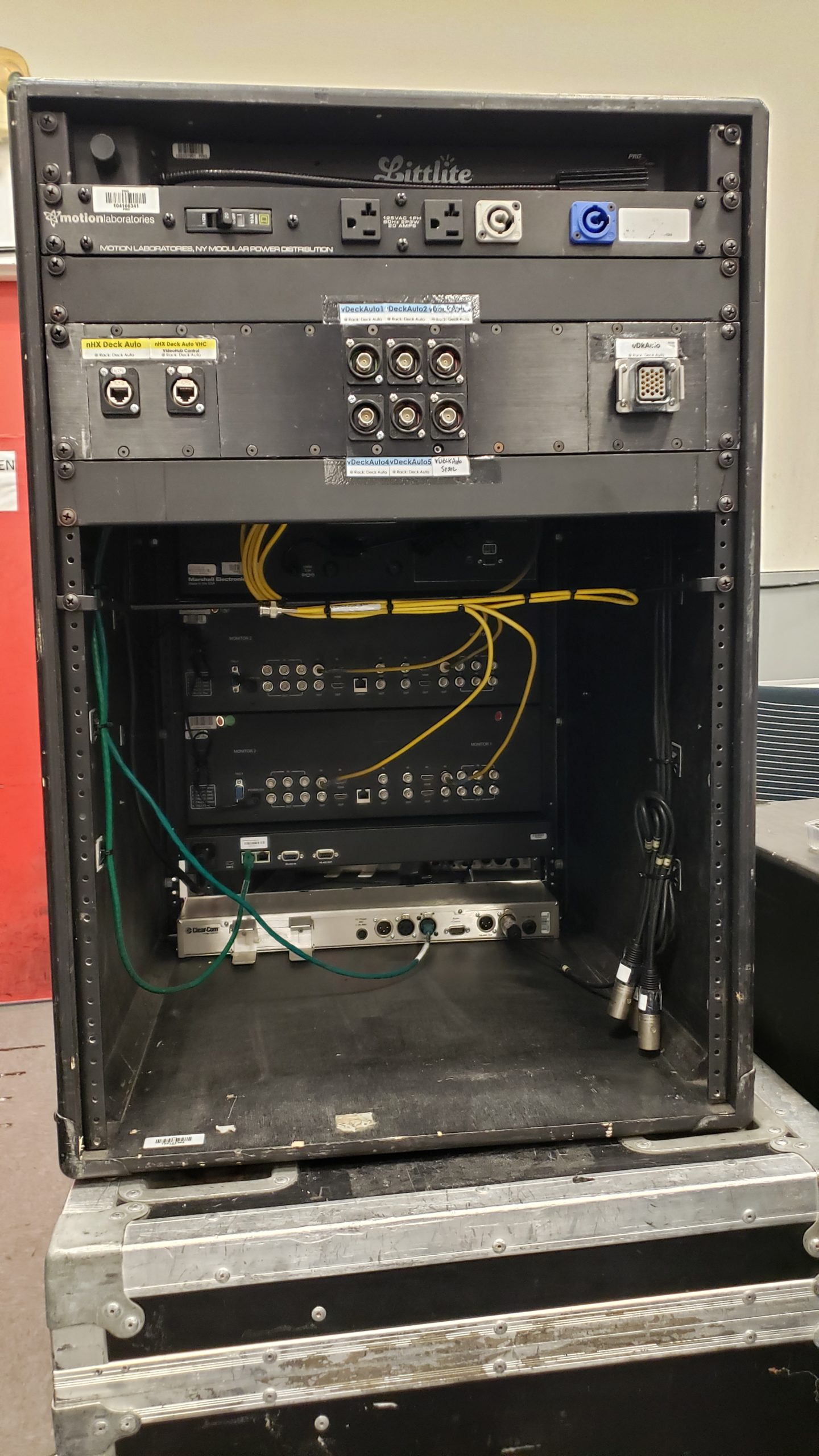 Building racks means wrangling up all the gear that goes into that rack, screwing it into the slots where the drawing indicates that it should go, then elegantly labeling, running, and connecting the gear’s power supply (if applicable) and short cables known as interconnects that go between the front of the rack (where most of the gear is) and the back of the rack. On the rear side of the rack, you will usually add some sort of panel mount or Stek (brand name) panel with connector barrels on it that merge the bundle ends to the interconnect ends. That way once the crew in the theatre gets the bundles, all they have to do is plug the labeled ends into the back of the rack at the labeled ports without having to dig around inside the rack to find the right port for each connection.
