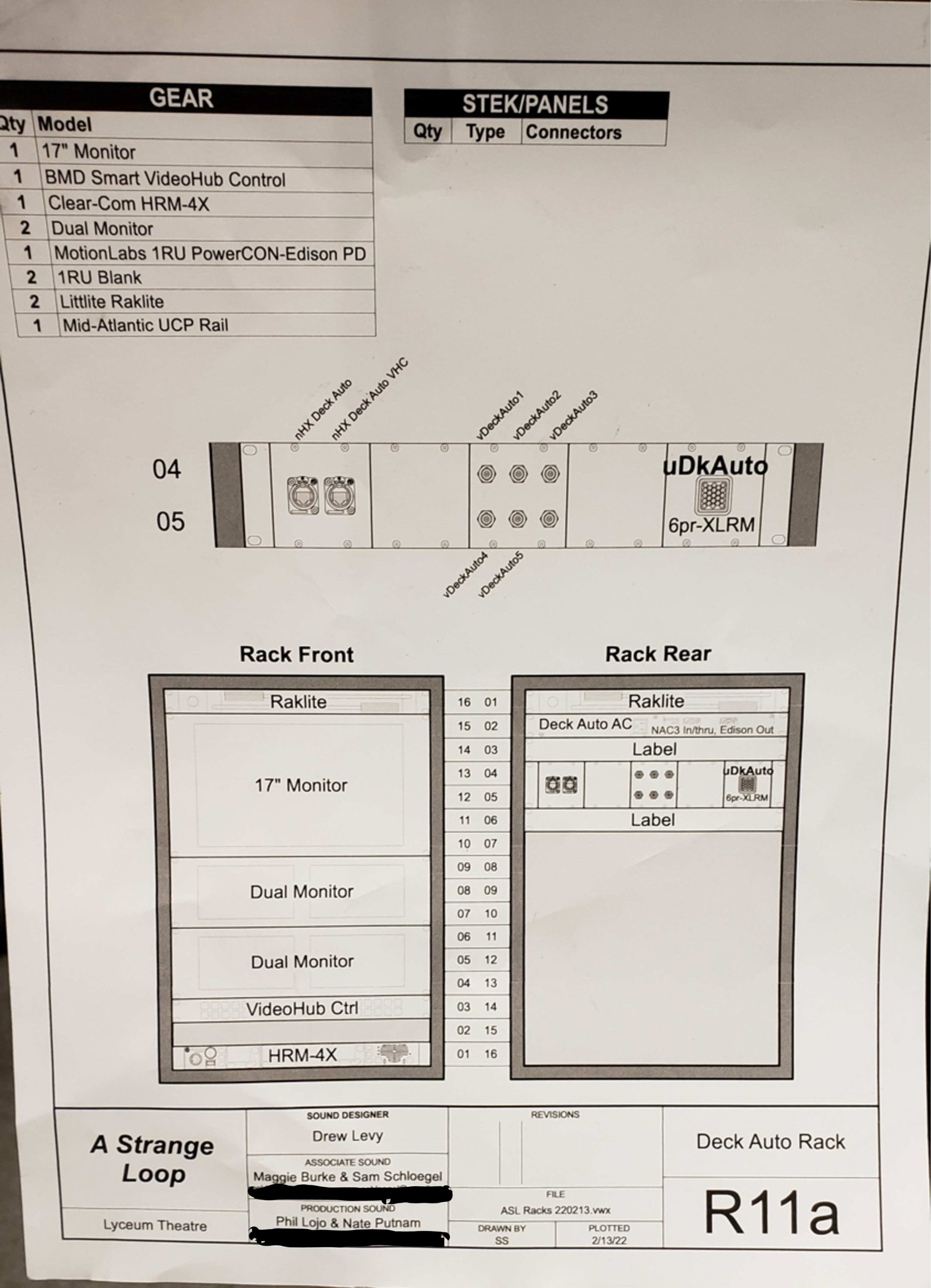 “L: the rack drawing for the Deck Automation rack for the Broadway production of “A Strange Loop”. C&R: the finished rack viewed from front and rear! Rack drawing by Sam Schloegel.”