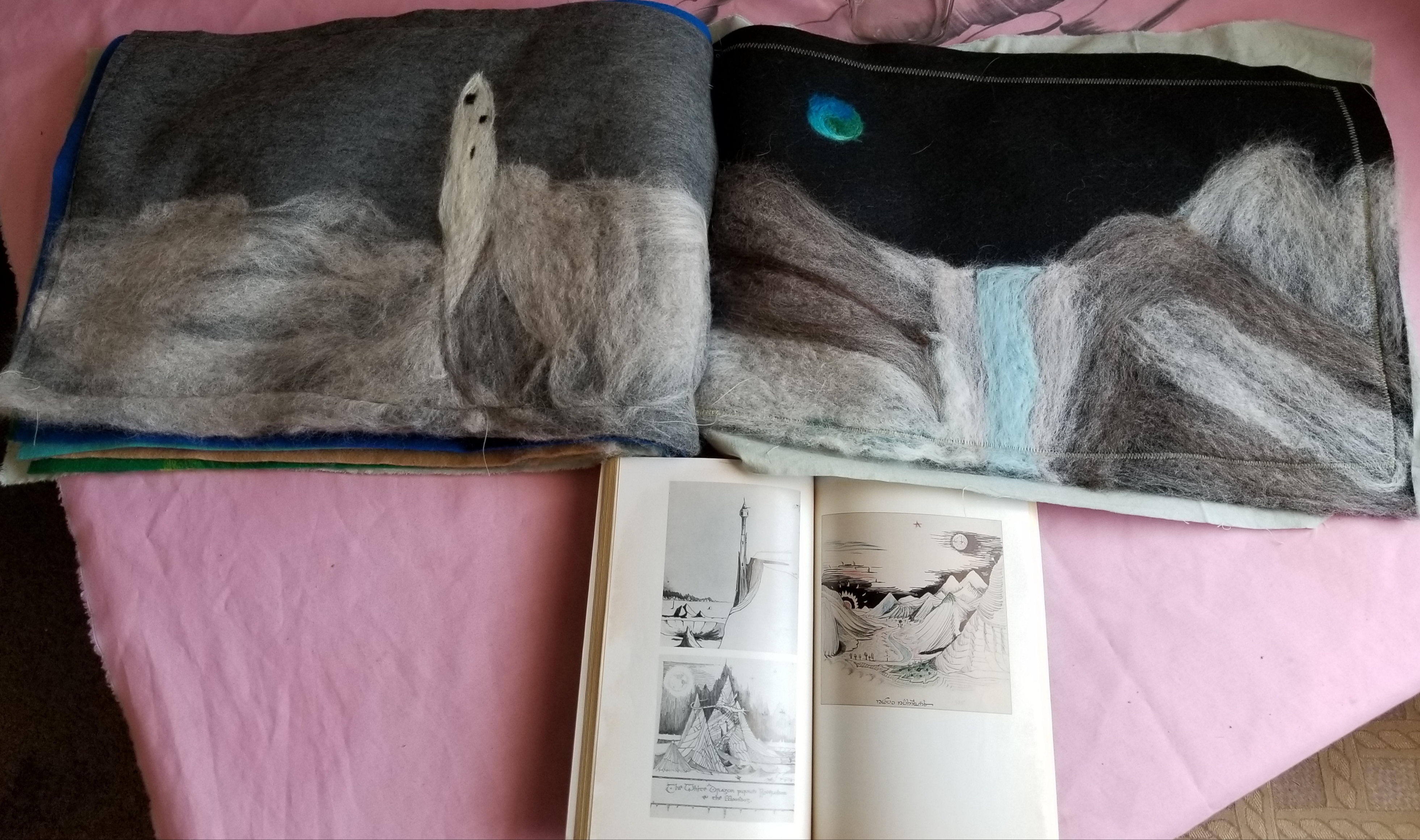 I recently have had the opportunity to try my hand at mixing mediums. In August, I gave birth to a new little SoundGirl, and I wanted to share with her one of my favorite stories: Roverandom by J.R.R. Tolkein. I want her to follow along with me, but also was have the story available if she was babysat by grandparents. In my copy, the publishers thoughtfully included prints of Tolkein’s illustrations, and I used those as a guide for a fabric book and a radio play. The mood and style permeate through the scene designs done in felt, while the narrative and characterizations are explored through sound effects, voice, and music. Together the confluence is grander than the sum of its parts and makes me a better sound designer.