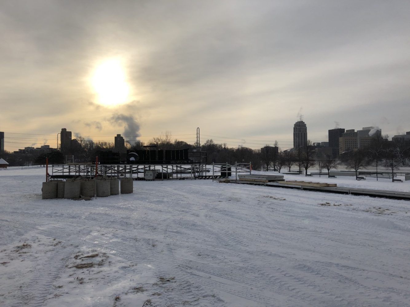 Day one was the location mapping. It was cold, windy, and cloudy, but the overnight snow had stopped, and it was just a matter of commuting through the fresh 6 inches to get to the site to clear the spaces for the staging and tents. This was a short quick meeting, where we marked out the primary locations and then directed the plow drivers where to clear the snow. The entire setup was based on the backdrop the location provided — a stunning image of the landscape and the city skyline.