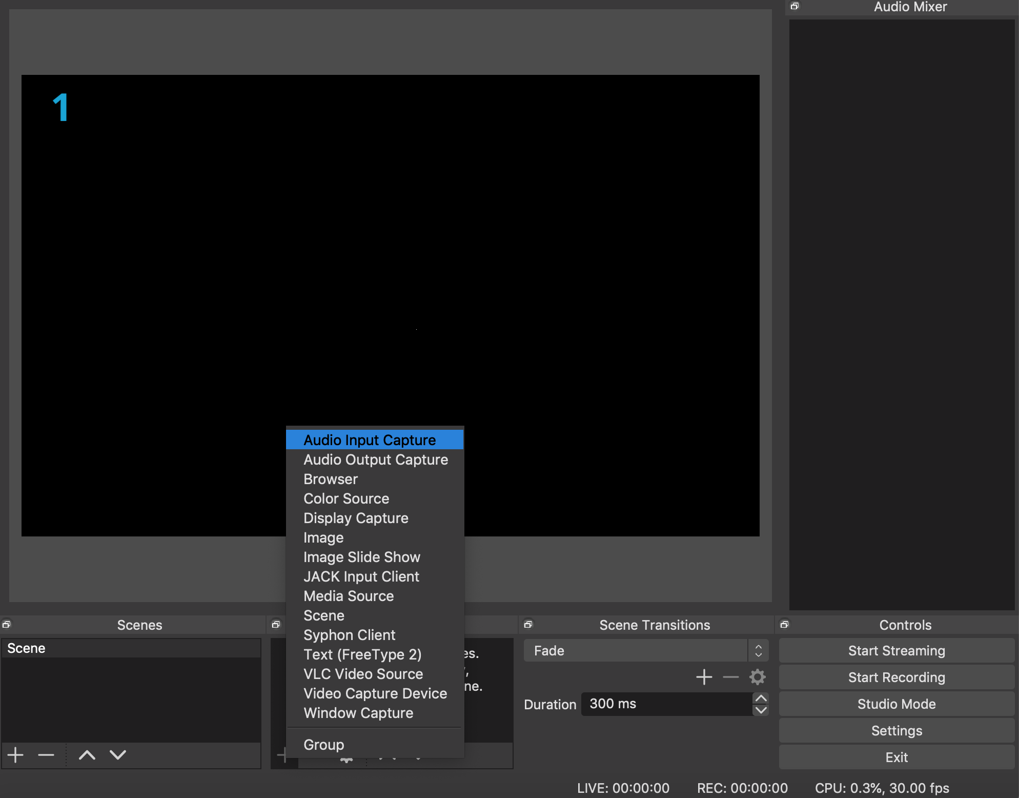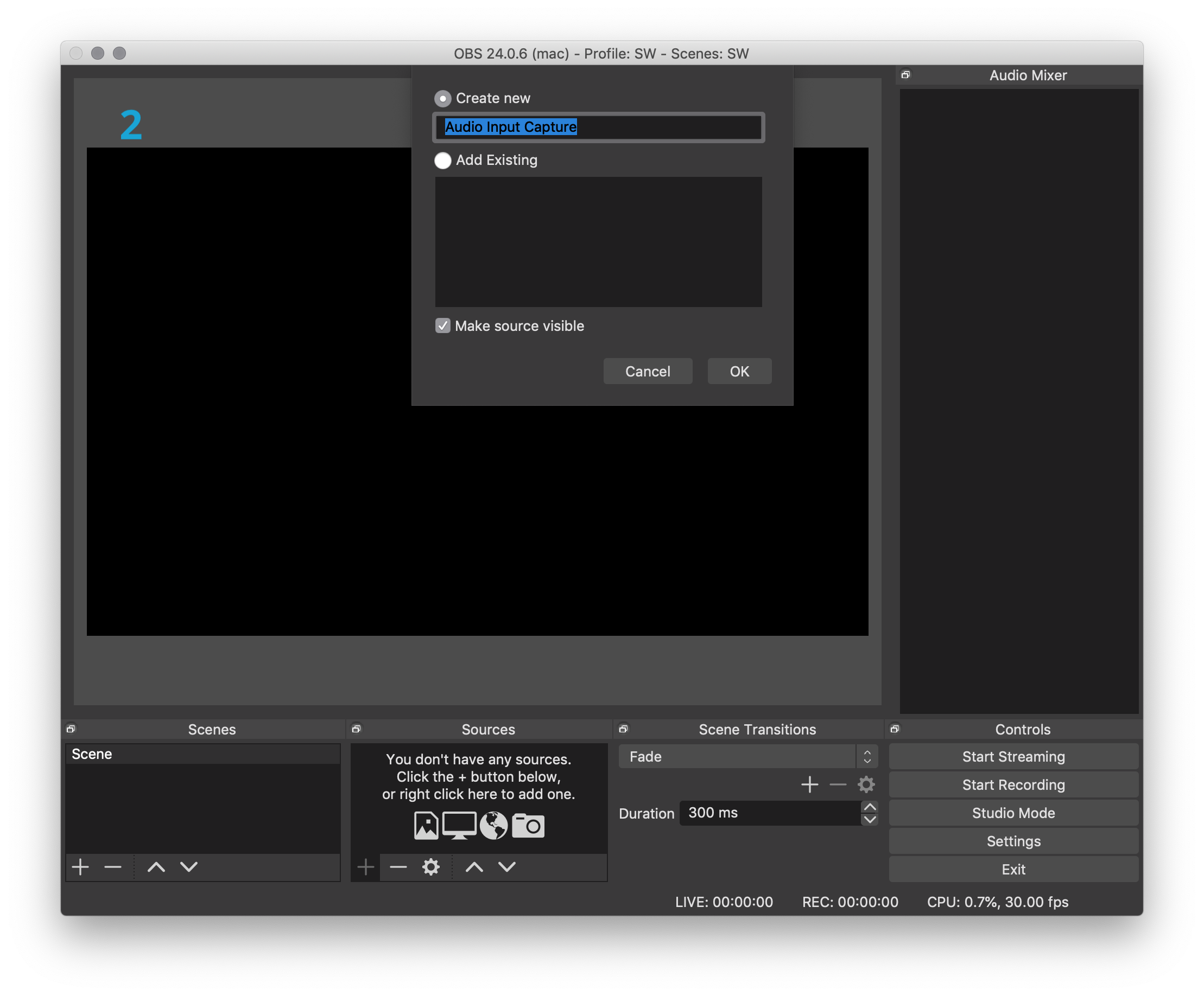 Once configured, you will have a blank slate – just 1 scene without any sources. Work through your signal flow, you will need to add each source individually to start. Once you have a few that always work together, you can group them or make a scene with your standard setup.