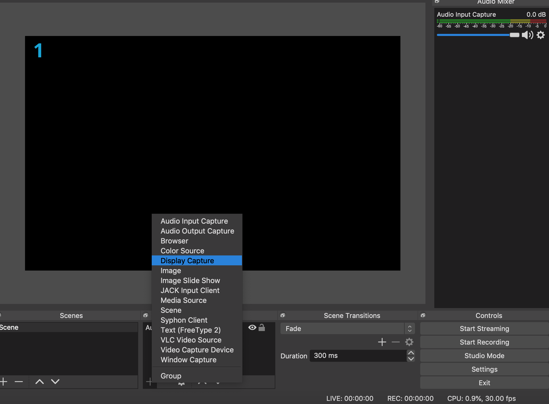 Click on the + under sources to add your second source – your Display Capture. This is how you will capture the keynote, website, software, whatever it is that you will want to capture for your recording. You will need to grab the red edges of the screen capture to resize it.