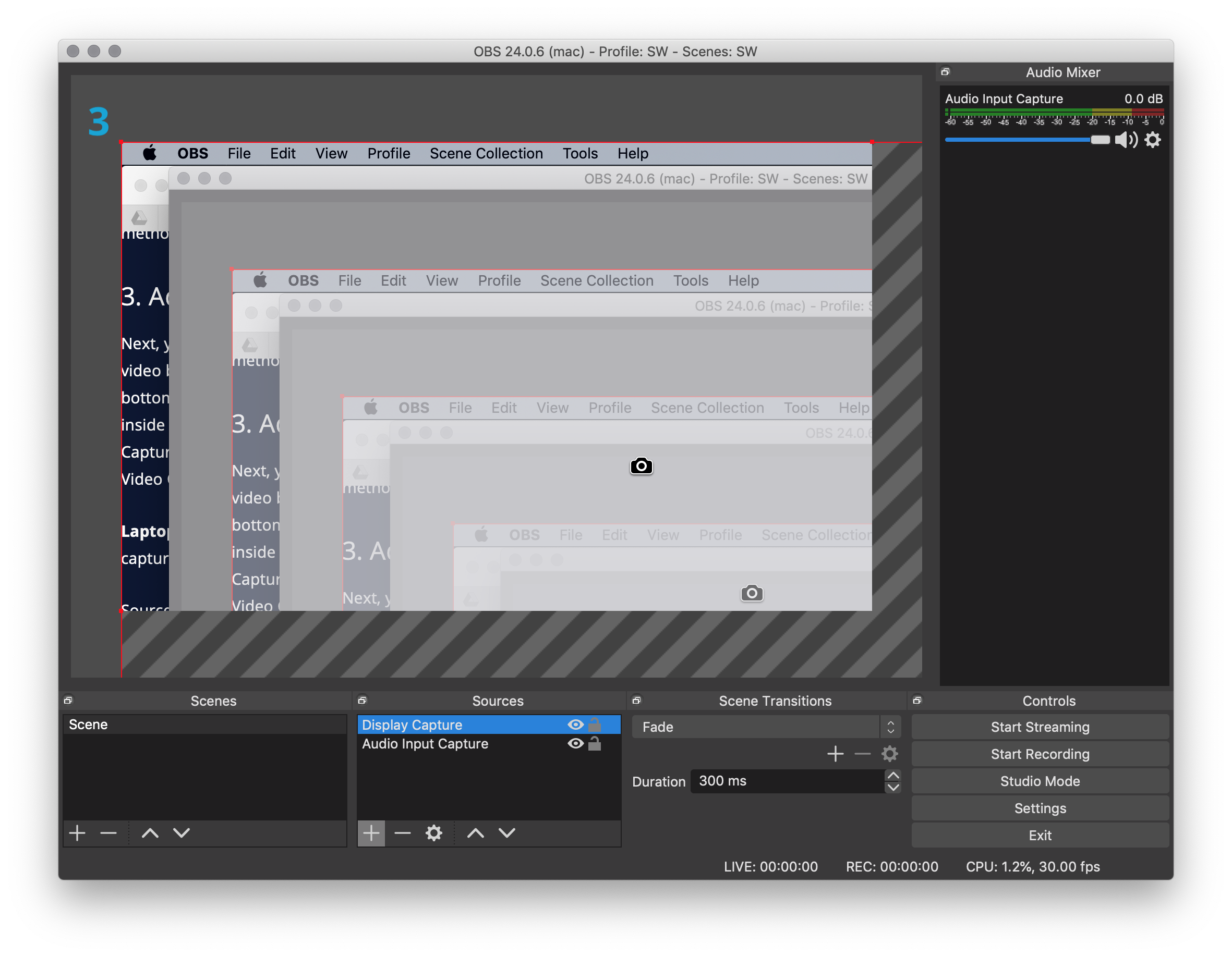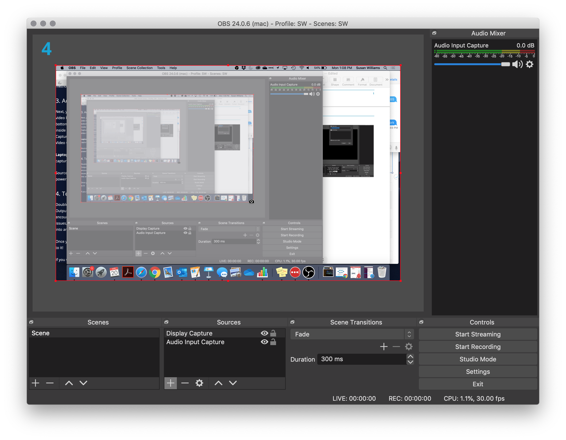 In the bottom right, select STUDIO MODE. This will allow you to preview what scene is coming up next. You can set up shortcut keys, or just use your UP/DOWN arrows to switch between the scenes. Leave it on the PIP if you want to keep it simple. Select Start Recording, notice the record time in the bottom. Full-Screen your presentation, software, whatever you are using, and do your thing. You may need to trim the beginning and end off, but you can do that easily within Quicktime or even within Youtube.